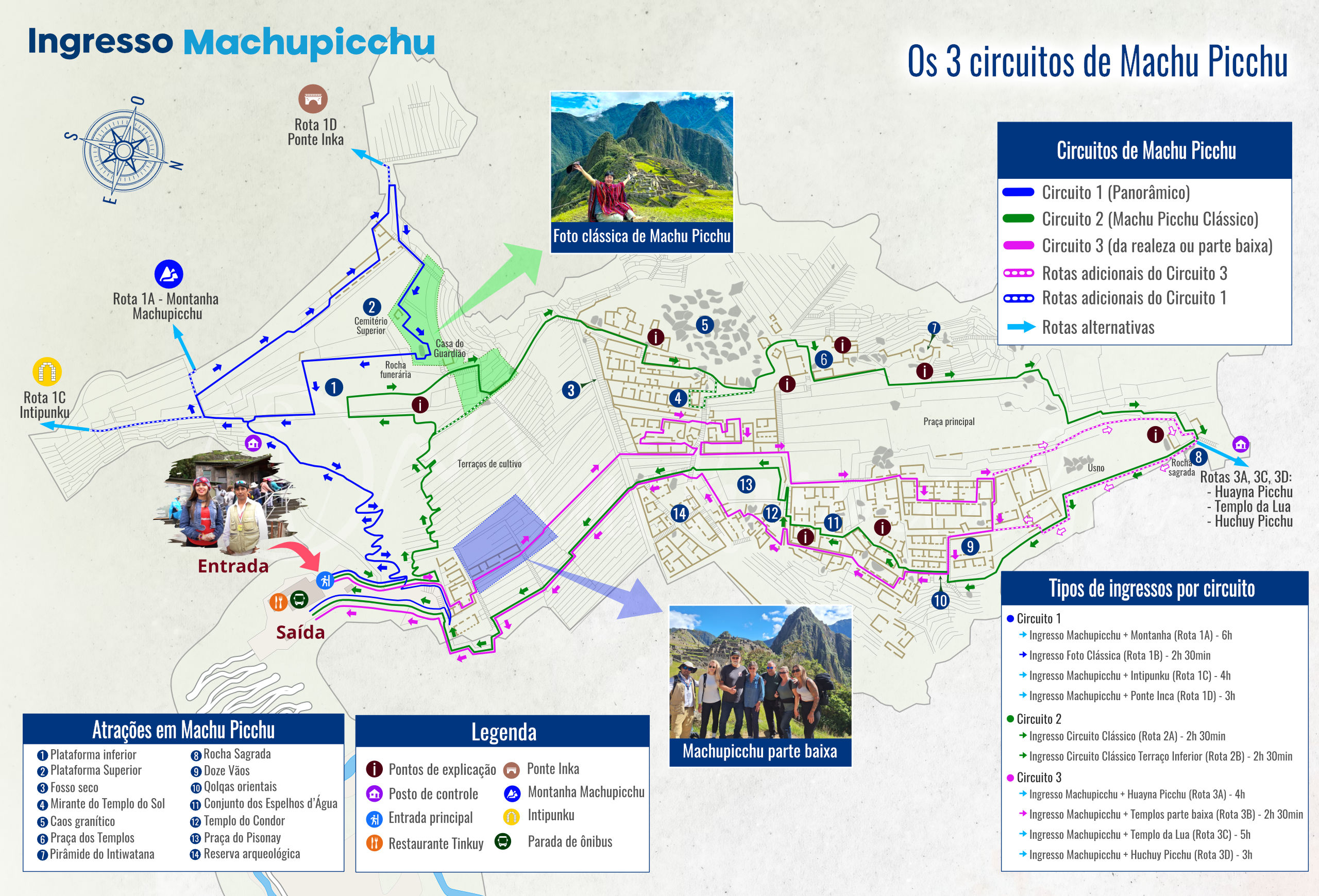 Os ingressos mais populares em Machu Picchu incluem um dos três circuitos oficiais que organizam o tour pela cidade Inca. O Ingresso Clássico Machu Picchu ou Ingresso para o Terraço Superior (Rota 1B) permite fazer o Circuito 1, ideal para quem quer a foto clássica do cartão postal. O Ingresso Circuito Clássico Projetado Machu Picchu (Rota 2A) oferece a visita mais completa às principais construções de Machu Picchu. O Ingresso para os Templos Inferiores de Machu Picchu ou Ingresso Real Projetado (Rota 3B) inclui o tour pelo Circuito 3, com foco na área inferior da cidadela, ao lado de templos icônicos. Além disso, Machu Picchu oferece trilhas pelas montanhas ao redor da cidadela, sendo o percurso mais solicitado o que leva até a Montanha Huayna Picchu, que também inclui a entrada em Machu Picchu pelo Circuito 3.