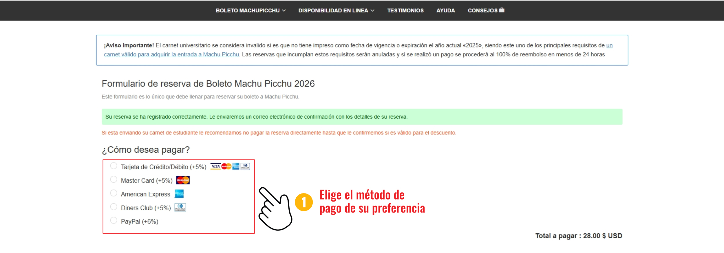 Cartão de reserva para reservar o ingresso para Machu Picchu com desconto para estudantes