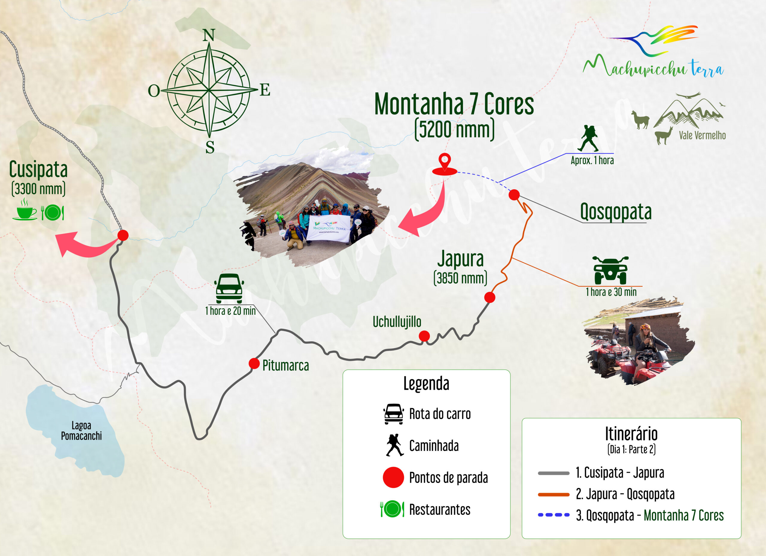 - Depois da aventura de quadriciclo, faremos uma caminhada de apenas 45 minutos até chegarmos à montanha de 7 cores.